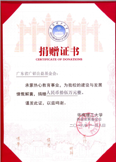 11月8日,廣鋁公益基金會繼續向華南理工大學捐贈人民幣15萬元,用于資助材料科學與工程學院、機械與汽車工程學院、經濟與貿易學院和設計學院等學院品學兼優的家庭經濟困難學生,共資助30人,每人5000元?;饡λY助的大學生寄予了厚望,希望每個被資助的學生自強不息、努力學習、早日成才,希望同學們要常懷感恩之心,傳遞愛心、回報社會,用身體力行回饋社會、幫助他人,在奉獻社會中實現人生更大的價值。