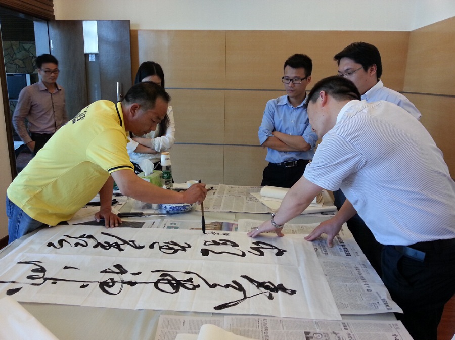 28日下午2時,書法比賽正式開始,首先開始的是鋼筆書法,各個參賽同仁都使出自己的看家本領,勾勒各自的創作,不到半小時一篇篇鋼筆字作品就此問世。鋼筆字作品里面不乏佳作,書寫手法有正楷的、隸書的、小篆等。接著,萬眾期待的毛筆書法開始了,參賽者們摩拳擦掌已久,對創作內容早已胸有成竹,只見廣鋁幕墻有限公司郭鴻杰正筆走龍蛇揮毫出狂草大作,主題立意和筆尖功夫皆為上乘。在其完成大作后,向大家介紹到他所用的毛筆已有13年的歷史了。書生指尖的筆,猶如劍客手中劍,十年磨一劍,高超的技藝需要漫長的時間積累,終獲大成。正如廣鋁集團企業自身一樣,專注二十一年,全力打造“百年廣鋁”品牌。貴州廣鋁也在當天同步進行書法比賽活動,藏龍臥虎的貴州廣鋁也是佳作涌現,令人津津樂道。