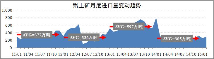 自2014年2月以來(lái),我國(guó)鋁土礦進(jìn)口量增長(zhǎng)一直保持在較低水平。監(jiān)控?cái)?shù)據(jù)顯示,2015年1-2月份進(jìn)口量分別為260萬(wàn)噸和300萬(wàn)噸,預(yù)計(jì)進(jìn)口量水平基本與2014年保持一致,全年月度平均進(jìn)口305萬(wàn)噸。當(dāng)期,山東宏橋、中鋁國(guó)貿(mào)和信發(fā)鋁業(yè)成為主要進(jìn)口企業(yè),進(jìn)口量合計(jì)占比85%;澳大利亞、印度和馬來(lái)西亞則是主要進(jìn)口原產(chǎn)地,當(dāng)期合計(jì)占比高達(dá)91%。