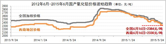 國產(chǎn)價格走勢偏弱。上半年國產(chǎn)氧化鋁價格維系了年初下滑的基本趨勢。截至6月16日,全國氧化鋁加權(quán)均價為2384元/噸,西南地區(qū)價格與全國加權(quán)均價的價差縮小至近50元/噸,同期均價為2330元/噸。其中,貴州均價為2340元/噸,略高于西南地區(qū)均價。從市場實際成交表現(xiàn)上看,雖然目前國產(chǎn)氧化鋁市場逐步恢復(fù)至去年平均水平,但在鋁價不景氣的環(huán)境下,氧化鋁市場價格難以堅挺。