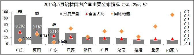 鋁材市場保持較快增長。監控數據顯示,自3月以來,我國鋁材月度產量均保持兩位數的增長速度,其中5月份全國鋁材產量444萬噸,累計同比增長10.7%,增幅環比回落1.6個百分點。從區域分布上看,山東、河南以及廣東仍然保持鋁材產量前三的位置,其中廣東5月份鋁材產量49萬噸,全國占比11%,但同比增速較上月回落了6%,降幅收窄0.3個百分點。