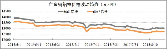 鋁棒市場價格持續(xù)下浮。截至8月20日,廣東省6061棒價格下浮至12,925元/噸,6063棒價格下浮至12,625元/噸,月化環(huán)比均下降1.5%。鋁棒價格下浮主要受原鋁市場價格下浮的影響,但鋁材生產旺季需求及鋁材出口穩(wěn)定增長因素將會對鋁棒價格形成有力支撐,預計6061棒的價格區(qū)間將回升在T60的水平(T60=13,300元/噸)。