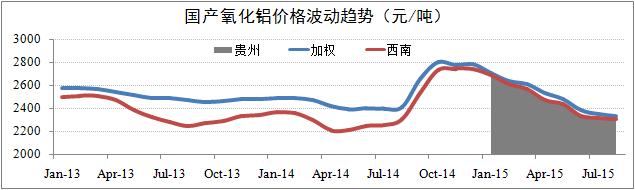 國產價格繼續下浮。報告期內,國產氧化鋁價格仍維持繼續下滑的基本趨勢,但整體降幅有所收窄。截至8月19日,國產日均價為2,325元/噸,月化同比下浮2.2%。其中,西南地區報價2,285元/噸,月化同比下浮0.9%;貴州報價2,285元/噸,月化同比下浮1.7%。目前,國產氧化鋁價格上浮機制尚未形成,預計第三季度氧化鋁價格將維持在2,250-2,450元/噸的均衡水平。