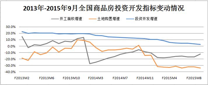 國家統計局數據顯示,9月份全國商品房土地購置面積累計同比降幅為33.8%,環比擴大了1.7個百分點;新開工面積累計同比降幅為12.6%,環比收窄了4.2個百分點;投資開發額累計同比增長2.6%,環比收窄了0.9個百分點。受土地購置面積降幅擴大的影響,9月份國房景氣指數下跌至93.40,環比輕微下滑了0.06個點。