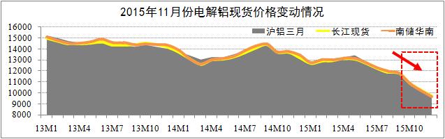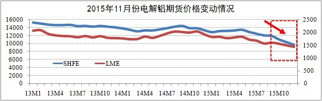 期貨市場方面截至11月24日,滬鋁三月結算跌至9670元,自跌破萬元大關以來,滬鋁主力合約日均漲跌幅為1.4%-2.1%;LME鋁三月結算跌至1446美元,其跌幅自今年8月以來開始低于滬鋁跌幅。研究認為,滬鋁三月與LME鋁三月結算價將逐步筑底于9600元關口(Min.值),期鋁價格將迎來較大的反彈空間。