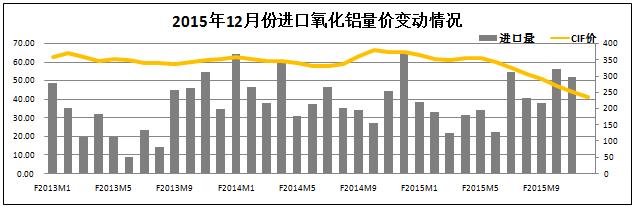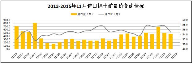 海關(guān)數(shù)據(jù)顯示,11月我國進(jìn)口鋁土礦460萬噸,環(huán)比下降了6.12%,降幅較上期收窄了21.8個百分點(diǎn)。價格方面,報告期內(nèi)進(jìn)口均價較上月普遍下降2-3美元的幅度,11月進(jìn)口均價為55美元。從數(shù)據(jù)分布上看,影響11月進(jìn)口鋁土礦量下滑的主要原因是大部分氧化鋁企業(yè)虧損,部分廠家開始減產(chǎn),同時進(jìn)口礦石價格下跌的觀望氣氛逐步增強(qiáng)。