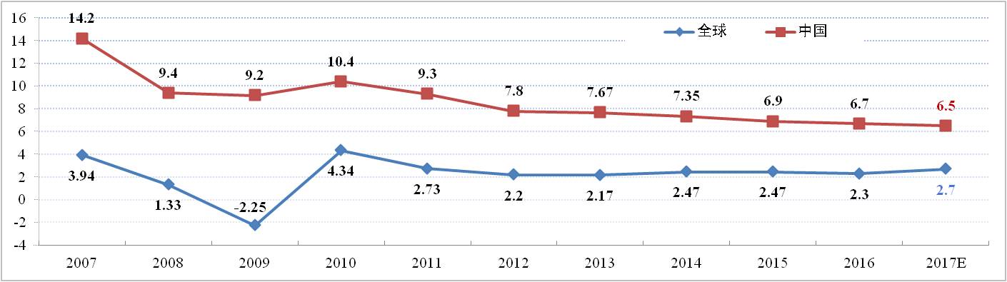 2017年一季度全球經(jīng)濟(jì)企穩(wěn)回升態(tài)勢(shì)明顯,主要表現(xiàn)在:全球綜合采購(gòu)經(jīng)理人指數(shù)(PMI)強(qiáng)勁回升已連續(xù)5個(gè)月超過(guò)53%,部分國(guó)家制造業(yè)庫(kù)存進(jìn)入上行周期;全球貿(mào)易景氣指數(shù)為102高于榮枯線100,這是繼去年第四季度出現(xiàn)反彈之后再次適度增長(zhǎng);新興經(jīng)濟(jì)體經(jīng)濟(jì)增長(zhǎng)指標(biāo)連續(xù)第四個(gè)月回升,并創(chuàng)下了五年來(lái)的新高。初步估計(jì),一季度全球經(jīng)濟(jì)環(huán)比增速折年率達(dá)到3.0%,同比增速2.7%,均較上個(gè)季度加快約0.1個(gè)百分點(diǎn)。預(yù)計(jì)二季度全球經(jīng)濟(jì)仍將維持這種企穩(wěn)回升的態(tài)勢(shì),增速為3.0%左右;2017年全球經(jīng)濟(jì)將增長(zhǎng)將維持在不低于2.7%。