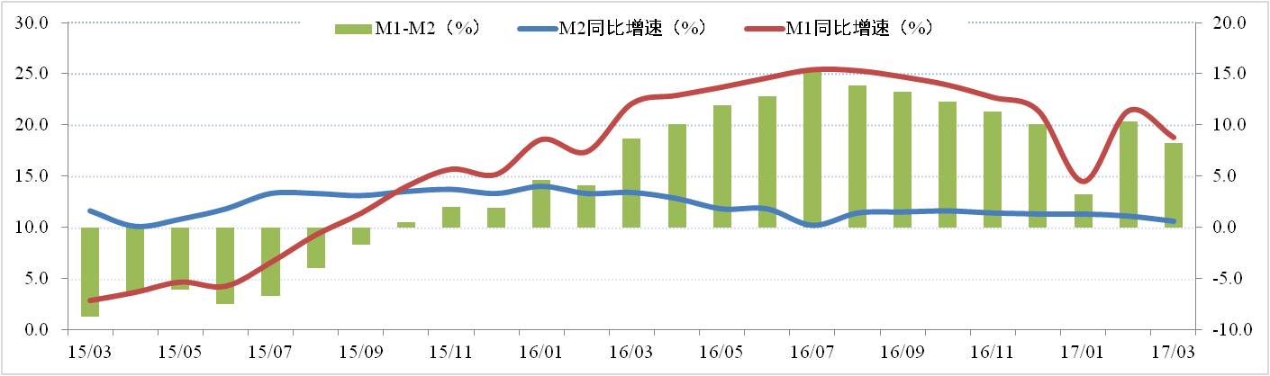 2017年2月廣義貨幣(M2)余額159.96萬(wàn)億元,同比增長(zhǎng)10.6%,增速分別比上月末和去年同期低0.5個(gè)和2.8個(gè)百分點(diǎn);狹義貨幣(M1)余額48.88萬(wàn)億元,同比增長(zhǎng)18.8%,增速分別比上月末和去年同期高2.6個(gè)和3.3個(gè)百分點(diǎn)。