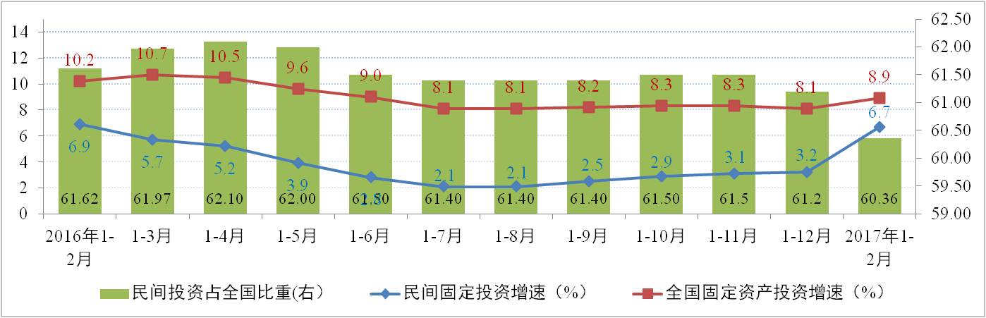 據(jù)國(guó)家統(tǒng)計(jì)局統(tǒng)計(jì)數(shù)據(jù)顯示,2017年1-2月全國(guó)固定資產(chǎn)投資完成額度為4.14萬(wàn)億元,同比增長(zhǎng)8.9%,增速比去年全年提高0.8個(gè)百分點(diǎn)。其中,民間固定資產(chǎn)投資額為2.98萬(wàn)億元,同比增速為6.7%,增速創(chuàng)11個(gè)月新高;較去年全年提高3.5個(gè)百分點(diǎn),連續(xù)第7個(gè)月增速環(huán)比提升。