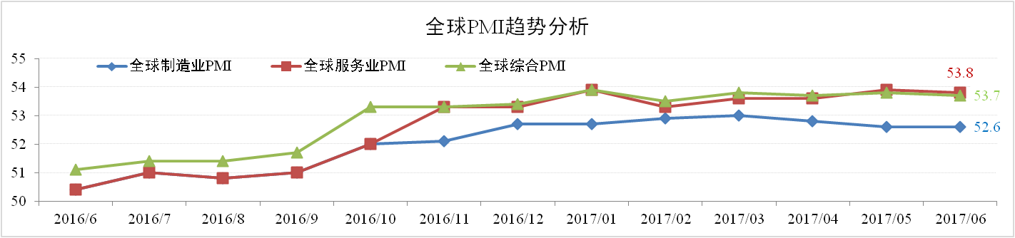 2017年以來,全球經濟延續復蘇態勢。據市場調研機構IHS Markit與摩根聯合發布的全球PMI數據顯示,6月全球制造業、服務業以及綜合PMI指數分別為53.8、53.7以及52.6,均處于擴張區間。同時6月亞太經合組織將2017年全球經濟增速預測由此前的3.3%調高至3.5%。