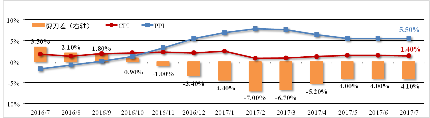 7月份全國居民消費價格指數(CPI)為1.4%,較上月縮小0.1個百分點,主 要原因在于水果大量上市致使鮮果價格下降以及豬肉價格疲軟。生產價格指數(PPI)為5.5%,連續三個月持平。剪刀差較上月擴大0.1個百分點至-4.1%。