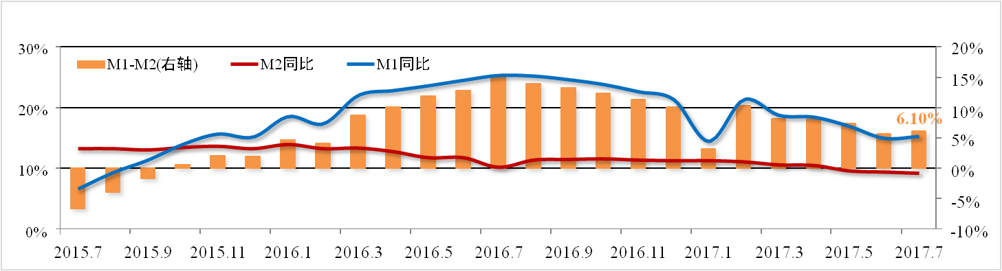7月份M2增速為9.2%,較上月下滑0.2個百分點,再創歷史新低。M1與M2 差額為6.1%,較上月擴大0.5個百分點。社會融資規模累計168.01萬億元,其中 實體經濟融資規模114.31萬億元,同比增長13.5%,較上月擴大0.4個百分點。