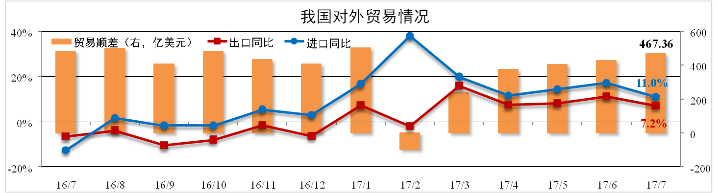 據海關總署數據,7月份我國進出口總值3405.55億美元,同比增長8.8%。 其中出口1936.46億美元,同比增長7.2%;進口1469.09億美元,同比增長11.0%; 貿易順差為467.36億美元,環比上漲9.3%。