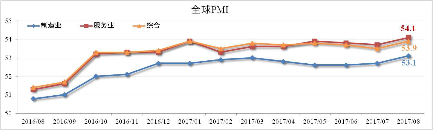 據(jù)HIS Markit與摩根大通發(fā)布的數(shù)據(jù)顯示,8月份全球綜合PMI為53.9,較7月擴大0.4個百分點,達2014年2月以來高點。其中服務業(yè)PMI為54.1,制造業(yè)PMI為53.1,均較上月擴大0.4個百分點。