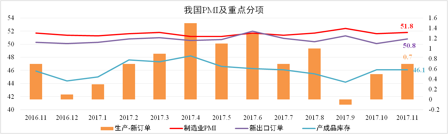 11月我國(guó)制造業(yè)PMI為51.8,較10月上升0.2。其中生產(chǎn)指數(shù)與新訂單指數(shù)差額擴(kuò)大0.2至0.7,新出口訂單上升0.7至50.8,產(chǎn)成品庫(kù)存與上月持平于46.1。