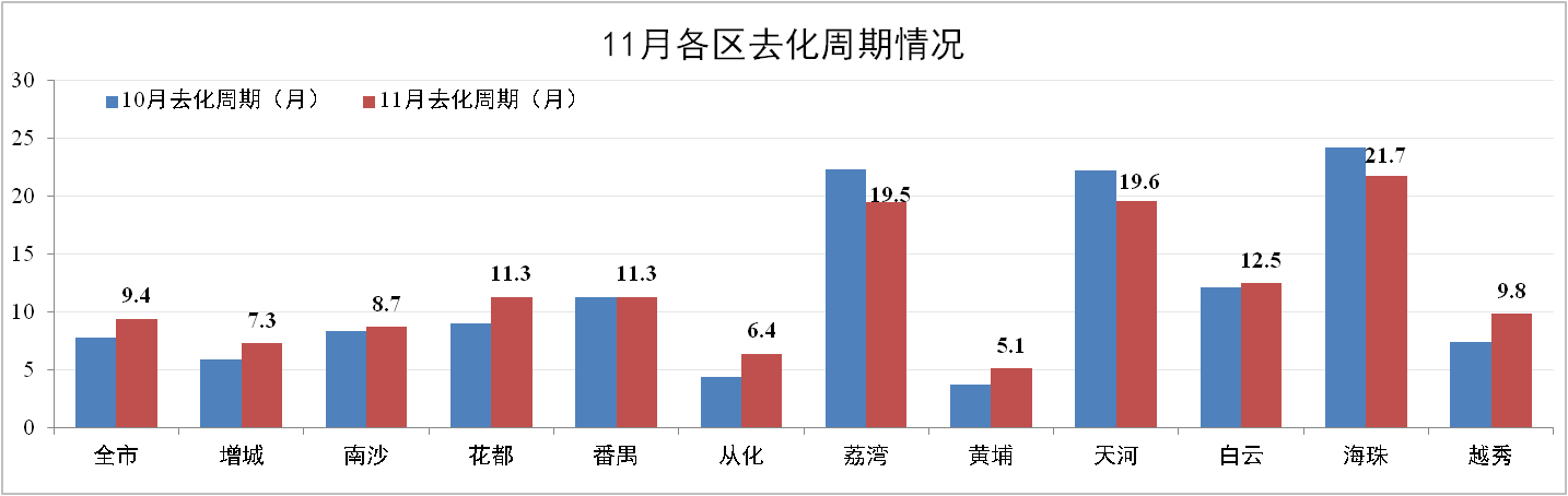11月份廣州住宅地產去化周期為9.4個月,環比10月增加1.6個月,總體庫存量為763.68萬m²,增城、花都等熱門區域由于新批預售集中在11月,拉動整體庫存量增加。