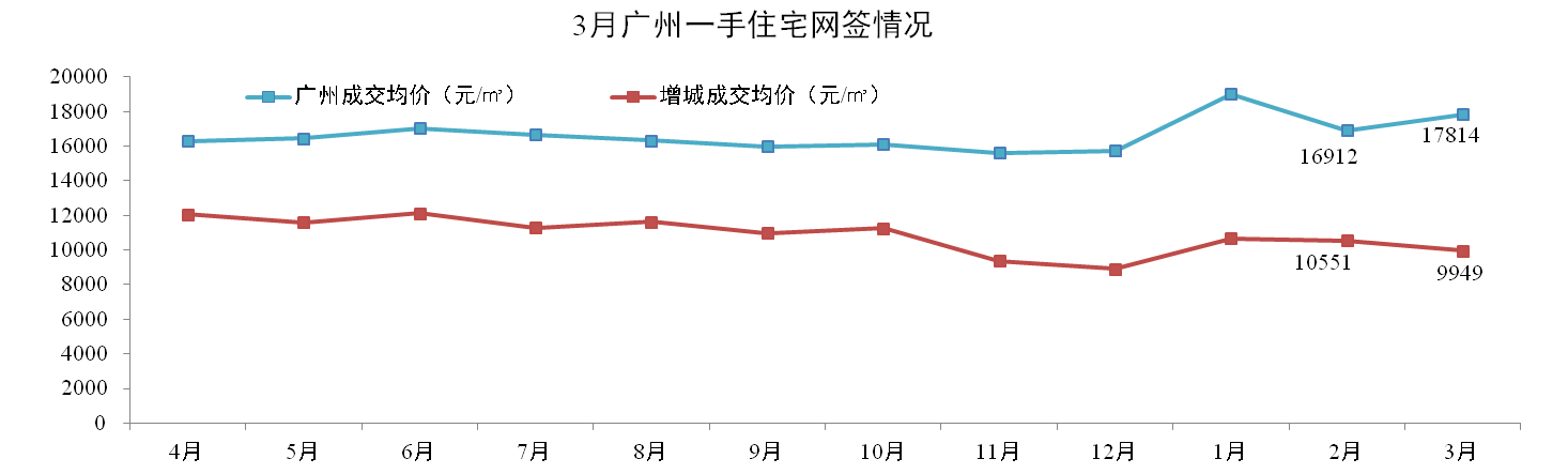 網簽價方面:3月份廣州一手住宅成交均價17,814元/m2,環(huán)比上升5.33%。其中,增城成交均價9,949元/m2,環(huán)比下降5.71%。