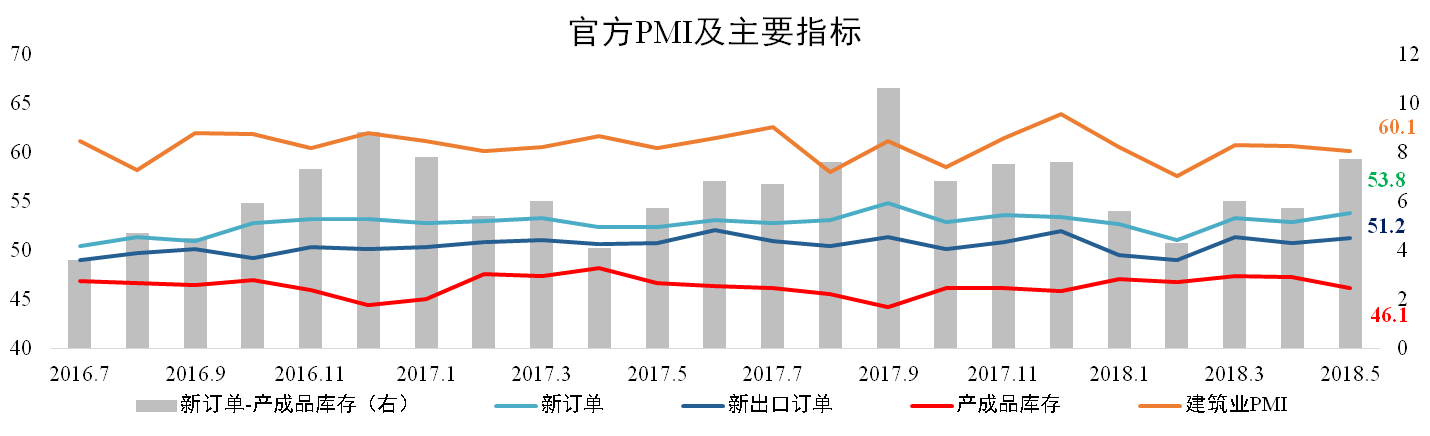 5月份產(chǎn)成品庫存為46.1點,較4月下降0.9個百分點;新訂單為53.8點,較上月上升0.5個百分點,其中新出口訂單為51.2,較上月上升0.5個百分點。建筑業(yè)PMI延續(xù)下滑走勢,較4月下滑0.5個百分點至60.1點。