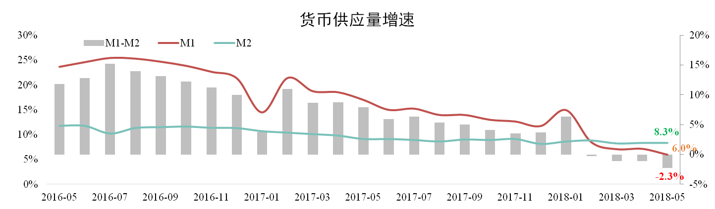 據人民銀行數據,5月份M1增速為6.0%,較上月下降2.3個百分點,創兩年新低。M2增速為8.3%,與上月持平。剪刀差為-2.3%,連續4個月為負,說明貨幣活力有所下降,實體經濟流動性偏緊。