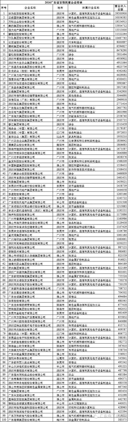 據(jù)介紹,省工商聯(lián)遵照全國(guó)工商聯(lián)關(guān)于開(kāi)展“中國(guó)民營(yíng)企業(yè)500強(qiáng)”排序工作的辦法和要求,今年首次開(kāi)展“廣東省百?gòu)?qiáng)民營(yíng)企業(yè)”排序工作。該榜單主要以2015年企業(yè)營(yíng)業(yè)收入為基本標(biāo)準(zhǔn),以企業(yè)會(huì)計(jì)年表為依據(jù),排序經(jīng)有關(guān)部門審核。